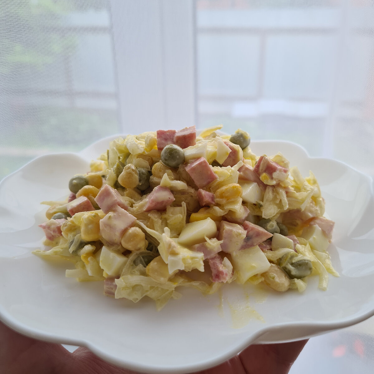 Отыскала рецепт салата в своих старых записях. У меня несколько кулинарных тетрадей, куда я записываю рецепты. И вот решила полистать одну из. Я и не помню, когда я делала этот салат, но раз записан, значит мне он понравился. Решила готовить, итог просто бомба) Интересный и необычный вкус, не зря я его записала) Нам понадобится: Для начала капусту нужно нашинковать. Солим её, я посолила 1 ч.л. Этого вполне достаточно, и ориентируйтесь на соленость ваших колбас. Хорошо отжимаем капусту, чтобы она дала сок и уменьшилась в размере. К капусте отправляем кукурузу И горошек Яйца режем кубиком и тоже отправляем в салат. Затем я порезала ветчину, также кубиком. Её у меня вышло примерно 130 грамм. И варено-копченную колбасу (сервелат). Колбасы у меня вышло около 140 грамм. Вы можете взять что-то одно. Заправляем майонезом, хорошо перемешиваем и готово! Готовьте! Радуйте себя и своих близких ❤ Приятного аппетита 🥰 Заходи ко мне на канал и подпишись, пожалуйста, а я буду радовать вас новыми