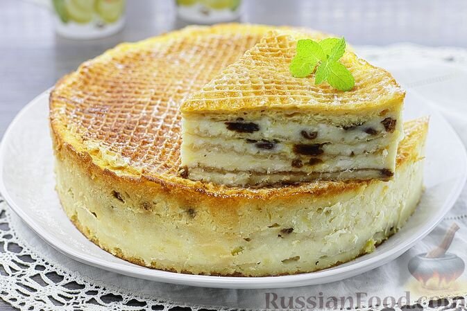 Вафельный торт с начинкой из творога, яблок и изюма выпекается в духовке, в отличие от привычного варианта торта из вафельных коржей. Коржи прослаиваются творожной начинкой, заливаются молочно-яичной заливкой, после чего тортик отправляется в духовку. По вкусу торт напоминает запеканку из творога и блинов. Вафельные коржи становятся мягкими и отлично сочетаются с творожной начинкой.