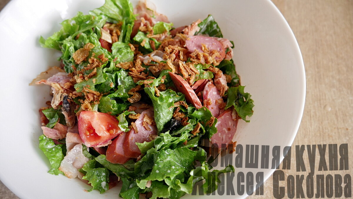 Доброго вам дня, дорогие читатели!😊 Выходные же. А это значит, что супруга выгоняет меня с кухни и сама что-то делает. Как правило, салаты. На этот раз он прям мясной-мясной. Я бы даже сказал, что чисто мужской салат на закусь. Если бы не одно «но». Я понимаю, что вкусы у всех людей разные, и кому-то такой салат точно зайдет. Мне не зашел. Положение не спас даже мой любимый бекон, который готов пихать куда угодно 😊 И соус «Цезарь», опять же – субъективно – здесь не к месту. Мы этот салат, конечно, поели, но откровенно говоря, без восторга. Я потом колбаски и бекон из него выковыривал 😊 А вот с предложенными Еленой изменениями согласен полностью - будет вкуснее. В общем, ухожу-ухожу. Домашняя кухня Елены Соколовой Добрый день, всем! На этой неделе моя подруга опаздывала на обед, и я в ожидании встречи сидела и изучала меню одного из ресторанчиков нашего города. Красивые фото, аппетитное описание блюд, в общем, решила на выходных повторить один из салатов. Название у него креативное «