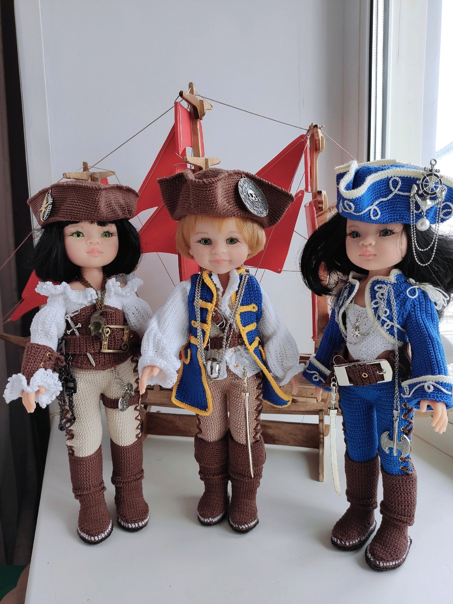 Всем привет с холодной Сибири! А то вдруг вы уже от жары устали? Вот и закончила я своих пиратов, они благополучно поохотились в Северных морях и вернулись с добычей домой. И никогда не дождется моя Ассоль своего Грэя. Хотя- "Однажды утром в морской дали под солнцем сверкнет алый парус. Сияющая громада алых парусов белого корабля двинется, рассекая волны, прямо к Ассоль. Тихо будет плыть этот чудесный корабль, без криков и выстрелов." (отрывок с книги) Но вместо Грэя на нем будут пираты: Прекрасной троице стало интересно куда же держал путь Грэй и почему такие странные паруса? И их любопытство было удовлетворено, прекрасная Ассоль попала в руки к пиратам. Но что-то мне подсказывает, что Дарио ее не обидит. А вы как думаете? Но вот наконец-то они и дома, разложили свои сокровища, отметили на карте где побывали А где же деньги? Устроили разборки кто припрятал, оказалось все нормально, ну и хорошо что хоть не подрались, а то бы попортили мои наряды. Ну вот и мечта Ассоль сбылась, и нич