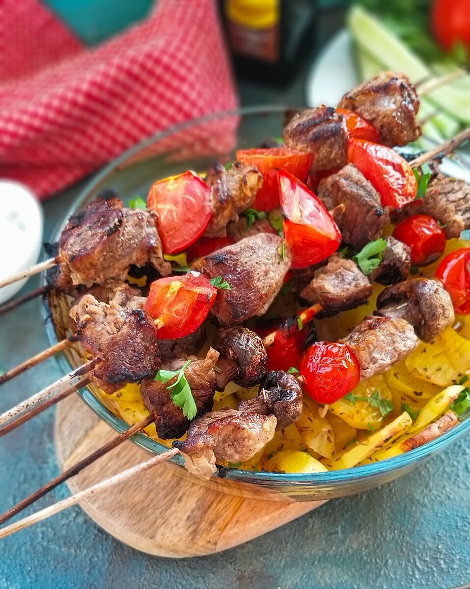 Ингредиенты: - 1 кг свиной или говяжьей вырезки - 1 большой лук - 3 зубчика чеснока - 1/2 стакана оливкового масла - 1/4 стакана соевого соуса - 1/4 стакана водки или коньяка - 1/4 стакана красного вина - 2 ст.л. сахара - 2 ст.л. уксуса - 1 ч.л. молотого красного перца - 1 ч.л. молотой корицы - 1 ч.л. молотого имбиря - соль по вкусу Приготовление: 1. Лук порезать кольцами, чеснок мелко порезать. 2. В блендере смешать лук, чеснок, оливковое масло, соевый соус, водку (или коньяк), красное вино, сахар, уксус, молотый перец, корицу и имбирь до однородной массы. 3. Вырезку нарезать кубиками примерно одинакового размера. 4. Выложить кусочки мяса в маринад и хорошо перемешать. 5. Накрыть миску пленкой и поставить в холодильник на 4-12 часов (чем дольше, тем лучше). 6. Вынуть мясо из маринада и нанизать на шампуры. 7. Жарить на решетке гриля или на углях до готовности. 8. Посолить по вкусу. Приятного аппетита!