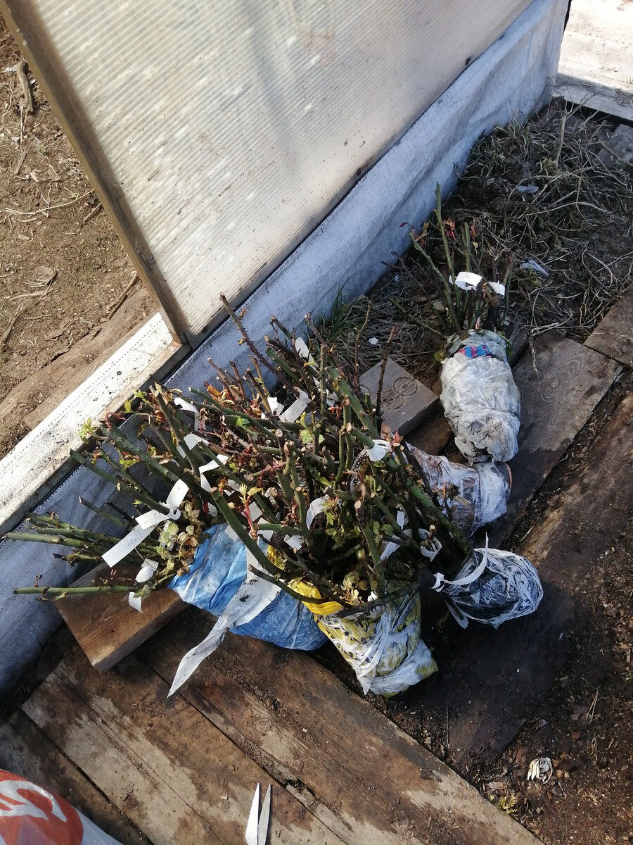 Интенсивность посадок нарастает, а желание с возможностью не совпадает. Как высадить то количество роз, что прислала Надежда? За десятка два? Крутила, вертела, желание имела, высадить хотела, да каждую в отдельности, в места почётные. Не сложилось, не получилось. Но и так оставлять нельзя. Надежда старалась, выбирала, паковала, отправляла, переживала. Надежда, дошли ПРЕКРАСНО! БЛАГОДАРЮ!!! Будет много красоты и благолепия! 🤗 К какому решению пришла? К траншейному! Почему? Рассуждаю просто. Что я хочу получить от этих ПРИВИТЫХ роз? Корнесобственные розы на моей почве, в условиях, приравненных к крайнему Северу. Если есть цель, значит нужно создать среду для получения. А что лучше, чем черенки, взятые с маточных кустов? Попробуем? Траншея готова, начинаю раскладку кустов вдоль неё. Раз куст, два куст, три и четыре, и далее, с расстоянием между ними в сантиметров 15-20. Разложила кусты, засыпала корни, ногами потоптала, граблями разровняла - первая партия готова. Если удачно сложило