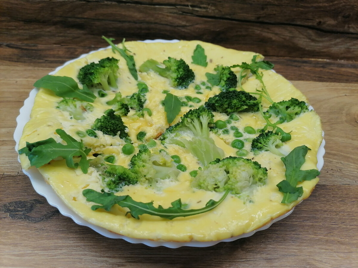 Ингредиенты: Отварить брокколи и зелёный горошек. (3 мин) Слить воду. В отлельной ёмкости смешать яйца, кокосовое молоко, измельчённый сыр, соль по вкусу. В разогретую сковороду смазанную маслом вливаем смесь из яиц, сверху выкладываем овощи. Готовим под закрытой крышкой на медленном огне 7 минут. Готовый омлет украсить зеленью. Приятного аппетита! 🫛🥦🥬 ККал всего продукта: 412 ккал; Кбжу: 28,80/27,72/12,51