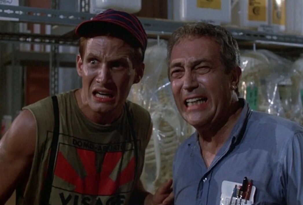 Уважаемые читатели, отвлечемся ненадолго от многогранного советского кинематографа и обратимся к классике мирового кино. К той ее части, которая сегодня оказалась в тени. В середине 1980-х годов ведущим трендом в жанре хоррора стали слэшеры. Яркие примеры тому – «Кошмар на улице Вязов», «Пятница, 13-е», «Хэллоуин». Мастерам фильмов ужасов, снимавшим фильмы о мертвецах, было непросто конкурировать с режиссерами, снимавшими фильмы о маньяках. Но были все-таки удачные исключения. Например, «Зловещие мертвецы» Сэма Рейми. Хотя в двух частях этой истории речь шла не о концепции оживших мертвецов, а о пробудившихся ото сна демонах. К тому же «Зловещие мертвецы» заимствовали элементы слэшера. Новый оригинальный взгляд на оживших мертвецов предложили Стюарт Гордон в «Реаниматоре» и Дэн О’Бэннон в «Возвращении живых мертвецов». «Возвращение живых мертвецов» 1985 года начинается с беседы двух сотрудников офиса – Фрэнка и Фредди, которых играют Джеймс Карен и Том Мэтьюз. Офис расположен рядом с к
