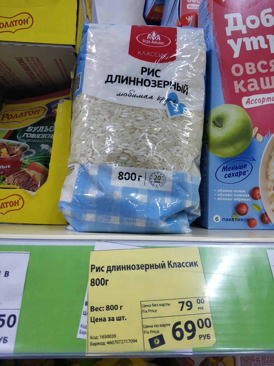 А еще кроме пополнения поменяли ценники, некоторые товары опять с двойными ценниками. Например, вот рис длиннозерный всегда покупаю, но в Магните существенно дороже такая пачка тоже 800 гр. А вот в Фикс Прайс пачка по карте теперь стоит 69 руб.