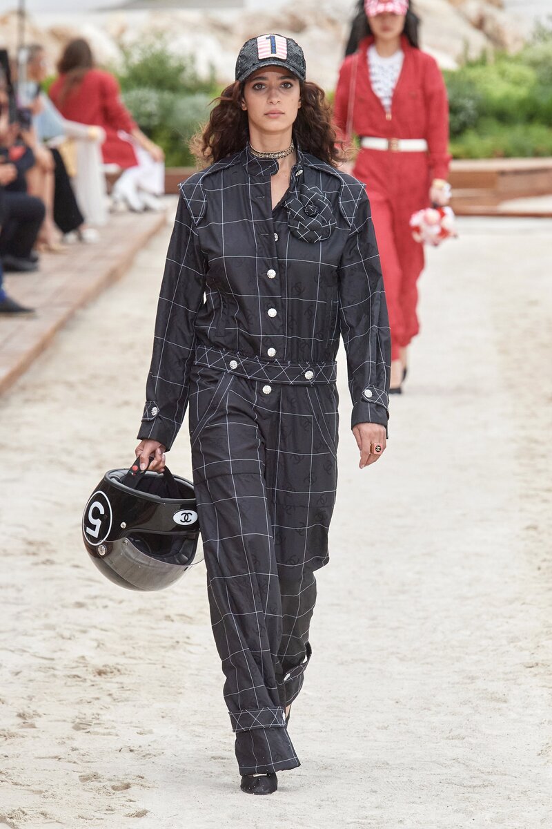 Показ круизной коллекции 2023 года состоялся 5 мая в Монте-Карло. В коллекции, традиционно, представлены летние вещи, вечерние и коктейльные платья, одежда для прогулок, обувь и аксессуары. Ожидаемо, мы увидели отсылки к Барби. Фильм должен выйти в июле, и мы увидим вокруг всплеск интереса к розовой тематике. Но давайте посмотрим и другие нюансы. Комбинезоны В коллекции представлены комбинезоны в стилистике Формулы-1, выполненные из твида и шелка. Представлены модели двух типов: приталенные или с заниженной талией. Лиф на пуговицах, брючины с манжетой внизу (джоггеры), наличие карманов. Обратите внимание на эти детали при выборе комбинезона на лето. Блеск: золото и пайетки Блеск везде: золотые брюки и бомберы, жакеты и платья из пайеток, аппликации, платья из блестящих тканей. Вписать блестящие модели в повседневный городской гардероб сложно, но возможно, если мы не говорим о платьях. Сочетаем блестящие бомберы с джинсами и наоборот. Кстати, блеск может быть и на подкладке. Шахматка