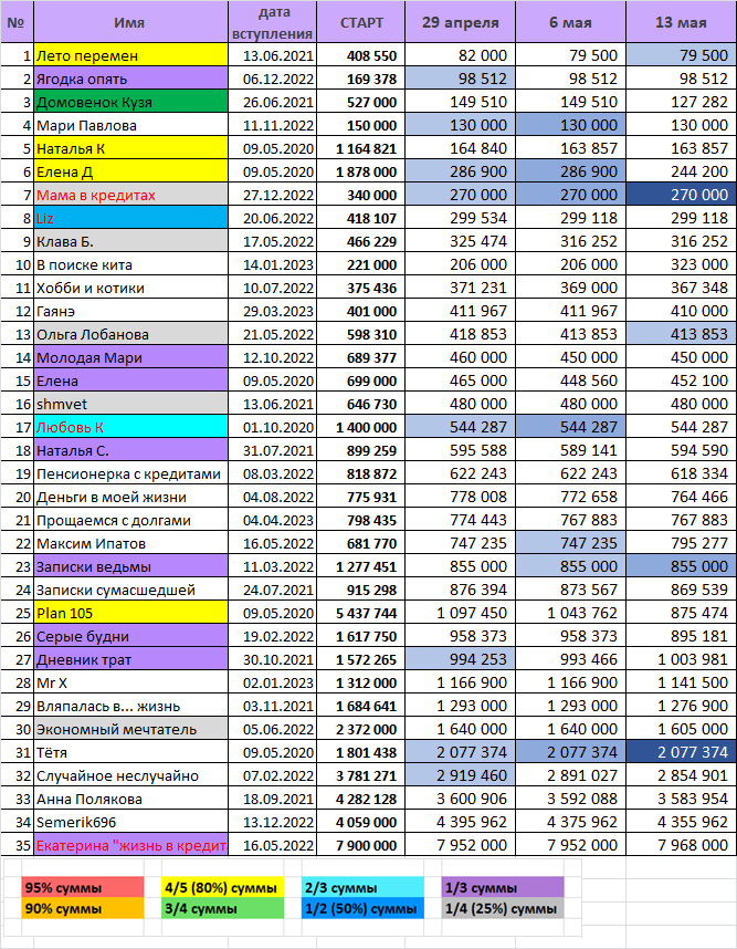 Всем привет! Вот и готовы результаты очередной недели. Что-то сегодня как-то грустненько в нашей таблице. Прогульщиков немного, но двое уже дошли до критической отметки. Если и на следующей неделе не объявятся, то придётся попрощаться. Не хотелось бы, но правила есть правила. Шестеро участников увеличили задолженность! Да, долги у всех колеблются, то вверх, то вниз, и бывает намного, но чтобы сразу у нескольких - такого, мне кажется, давно не было. Давайте не будем расслабляться! Тем более ещё даже лето не настало. Но участников, погасивших долги хотя бы немного, всё же больше. И это хорошо! Кто же погасил самые большие суммы за эту неделю, давайте посмотрим: На первом месте - Plan 105, погасившая 168288 рублей! На втором - Серые будни, минус 63192. На третьем - Елена Д. с результатом минус 42700. Поздравляем! Теперь как обычно, посмотрим, кто погасил больше всего в долях по отношению к собственному долгу прошлой недели: И Plan 105 снова на первом месте: её долг снизился на 16.12% за