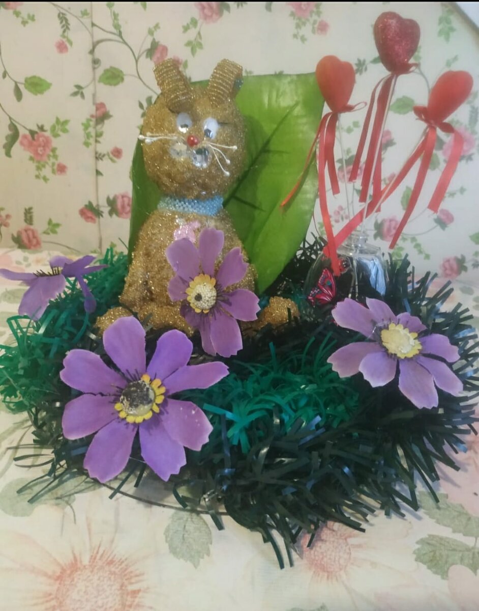 Зайка на полянке Форма зайчека посыпана бисером. Прикреплён лепесток. Шарфик сплетён из бисера. Приклеен значок зайки. Значок поставлен на специальную подставку. Поставлена вазочка для сердечек. Приклеена бабочка