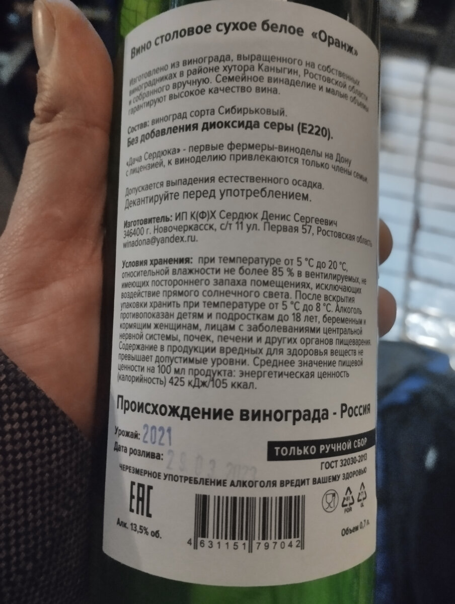У нас на Дону завелись натуралисты. То есть, делающие вино без диоксида серы. Этакая натуралочка. Я это пробовал по бокалам в одном московском баре. Впечатление странное, но не страшное. Итак, погнали. Цвет желтый. В аромате немного пыли, немного чайного гриба, зеленого чая, айвы, перезрелого персика, абрикос, курага. Во вкусе высокая кислотность, ближе к полному тело, средняя длина послевкусия с айвой и курагой, которое уходит в небольшую горчинку. Во вкусе зеленый чай и персик. Впечатление хорошее, "но это не моя чашка чая". Как говоря англичане. Вроде как оранж, а вроде как не он. Баллов 85. Так сказать, для поддержки российского виноделия. Внимание: чрезмерное употребление алкоголя вредит вашему здоровью