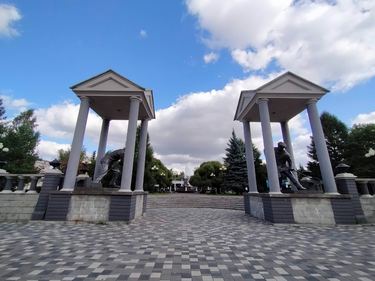 На карте Новокузнецка неподалеку от ЖД вокзала есть довольно большое зелёное пятно. При одном масштабе рядом можно увидеть надпись "Сад Металлургов", при другом - "Парк Гагарина". Какое же название правильное? 100 лет назад в этом месте так же все было зелено - здесь было довольно внушительное болото. В начале 30-х годов 20 века у болота решили отобрать небольшой кусочек: засыпали, облагородили, установили фигуры двух металлургов, а чуть позади организовали фонтан. 30 лет на небольшом пространстве гуляли горожане и только в 60-х годах болото было засыпано полностью, а на его месте разбит парк культуры и отдыха имени Гагарина. С тех пор эти два парка находятся рядом. Граница между ними условна, мне и в голову не пришло, что за 15 минутную прогулку я умудрилась побывать в двух парках сразу. Это неплохое, но довольно типичное зелёное пространство для отдыха в центре мегаполиса - газоны, лавочки, дорожки, несколько деревьев, пара интересных объектов. Специально сюда ехать смысла нет, но
