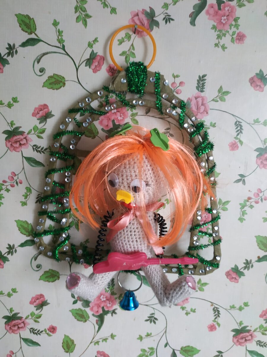 Одежная вешалка, обмотанная. Цветочным материалом и мишурой на проволоке обклеены стразами. Гитарист сделан из. Капс л от киндер сюрпризов , обвязан. Пряжей пехорка. Антенна детские болтики ,волосы сделаны из трессов, ручки сделаны из детской резинки ДВЕРНОЕ УКРАШЕНИЕ