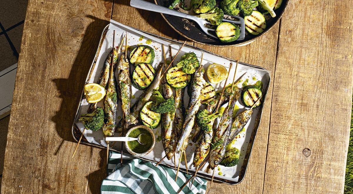 Корюшка с овощами на гриле, отлично сочетающаяся с травяными соусами, чесноком, черемшой и лимонным соком