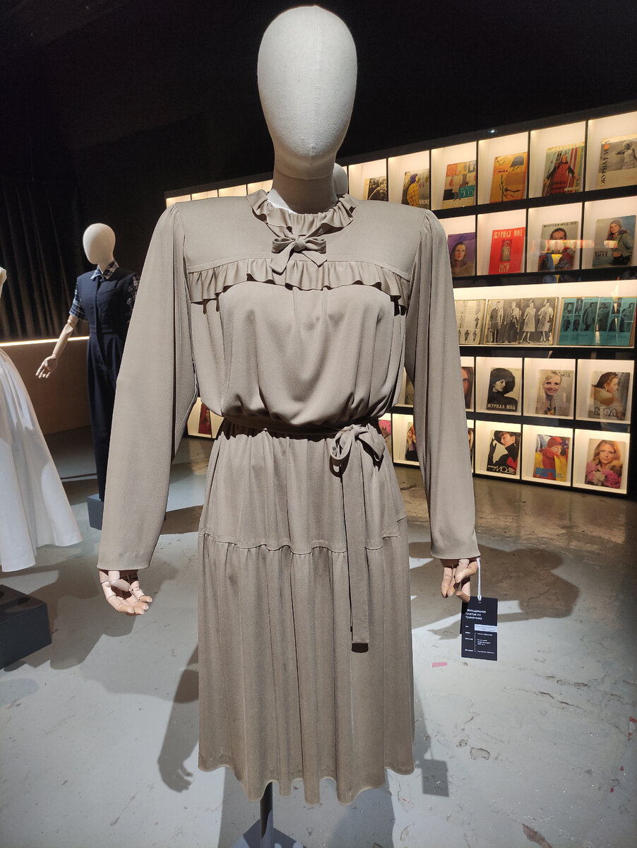 На выставке, посвященной ОДМО или Дому моделей СССР, выставлено несколько образцов на манекенах, сшитых в наше время по ретро выкройкам. Я уже показывала несколько образов, найти можно здесь: Это подборка по Музею Москвы, там много интересного, будет постоянно пополняться. Также есть и другие подборки, найти их легко: заходим на канал и под описанием видим Подборки, нажимаем на это слово и видим их все. Вернёмся к платью из журнала "Я шью сама" N2, 1984г. Автор платья Нинель Баскакова. Указано платье как молодёжное, но я даже не знаю, насколько молодые девушки в середине 80-х сочли бы его модным. Есть ощущение, что в те годы мир захватывали брюки и джинсы, шорты, легинсы, активно входили в моду футболки и джинсовки, подражая западным звёздам. Макияж и цвета в одежде становились ярче, а начёсы выше :) Я бы скорее сказала, что это платье для взрослой женщины от 30 лет, как минимум и в стиле 70-х. Очень спокойного цвета, без принта, скоромное и закрытое. Для какой-нибудь работницы интелл