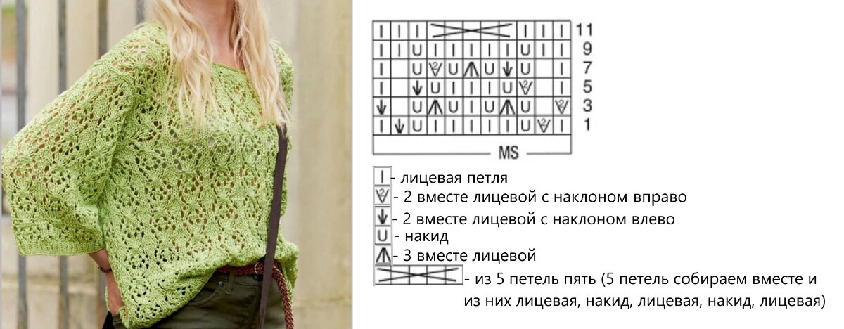Красивые летние узоры спицами. Узор №1. Смотрится очень изящно, вяжется легко. Набираем число петель кратно 11+2 кромочные. Раппорт состоит из 12 рядов. Во всех изнаночных рядах все петли будут изнаночные классические. Описывать буду без кромочных. 1 ряд. 1 лицевая, 2 вместе лицевой с наклоном вправо, накид, 5 лицевых, накид, 2 вместе лицевой с наклоном влево, 1 лицевая. 3 ряд. 2 вместе лицевой с наклоном вправо, накид, 3 вместе лицевой, накид, 1 лицевая, накид, 3 вместе лицевой, накид, 2 вместе лицевой с наклоном влево. Количество петель изменилось. 5 ряд. 1 лицевая, 2 вместе лицевой с наклоном вправо, накид, 3 лицевые, накид, 2 вместе лицевой с наклоном влево, 1 лицевая. 7 ряд. 1 лицевая, накид, 2 вместе лицевой с наклоном влево, накид, 3 вместе лицевой, накид, 2 вместе лицевой с наклоном вправо, накид, 1 лицевая. 9 ряд. 2 лицевые, накид, 5 лицевых, накид, 3 лицевые. На спицах снова все петли! 11 ряд. 3 лицевые, "из пяти петель пять" (вводим правую спицу под 5 петель сразу и вяже