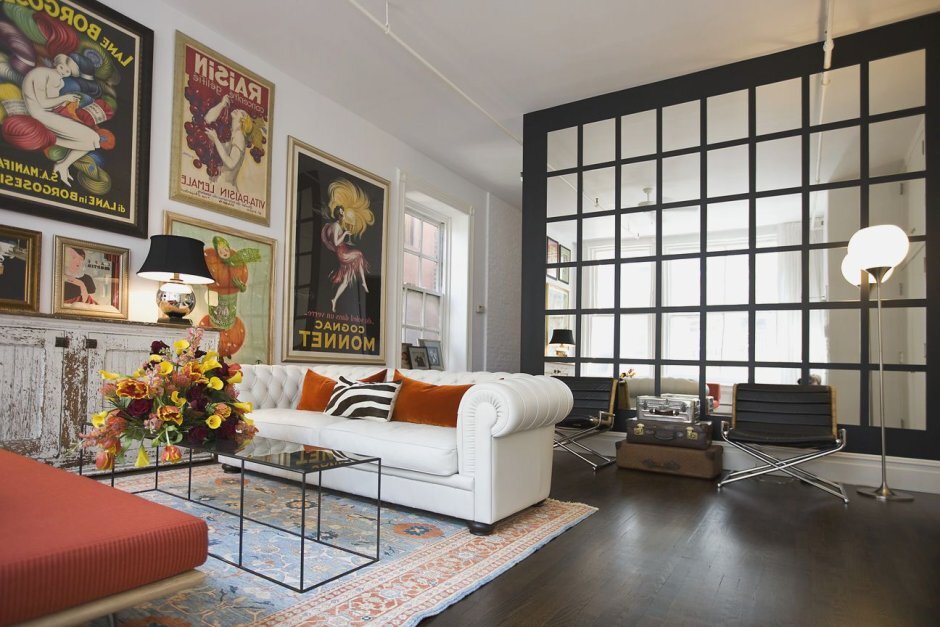 Этот стиль признает для мебели любые цвета и любые их сочетания: скажем, кресла одинаковой формы могут отличаться по цвету. Рядом с креслами и диваном расположится журнальный столик на тонких ножках: такие столики часто делают треугольными, с закругленными углами. Дополнят обстановку торшеры с яркими абажурами и — опять-таки! — постеры на стенах. Мебель может быть искусственно состаренной, сразу дающей понять, в какую эпоху предстоит погрузиться.