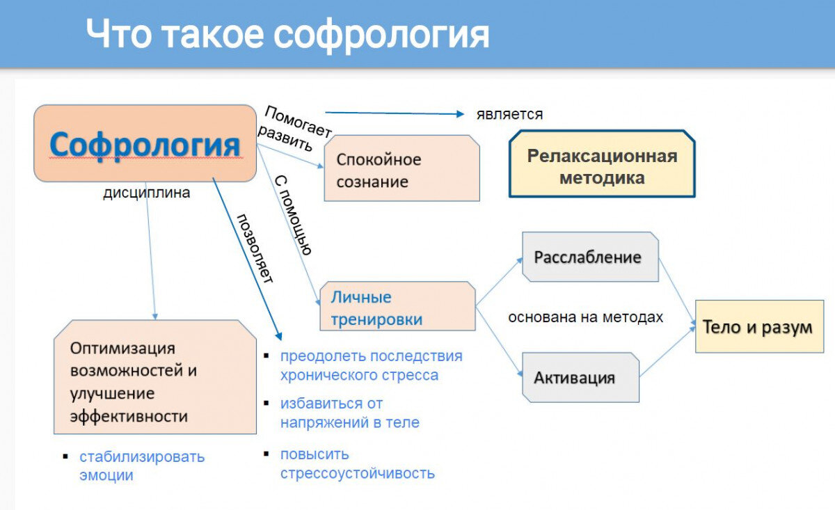 Полтора года назад я занялась изучением саморегуляции. Прочитала очень много статей (точно больше трёхсот). И пришла к тому, что мне интересно разобраться с тем, а что же такое софрология. Я прочитала книгу Мишель Фрейд "Примирить душу и тело", изучила кайседианскую софрологию. Автор этого направления - доктор Альфонсо Кайседо. Его дочь - Наталья Кайседо продолжает развивать кайседианскую софрологию. Можно найти достаточное количество видео с её участием, но все они на французском языке. На русском языке я не нашла ни одной научной статьи об эффективности этого метода софрологии, но на французском языке такие статьи есть. На картинке вы видите карту понятия "софрология". Конечно, можно ещё много элементов добавить в эту карту, но мы остановимся на основных моментах. Софрология - это дисциплина, которая помогает развить спокойное сознание как с помощью личных тренировок, так и под руководством специалиста. Софрология основана на методах расслабления и активации разума и тела. Софрология