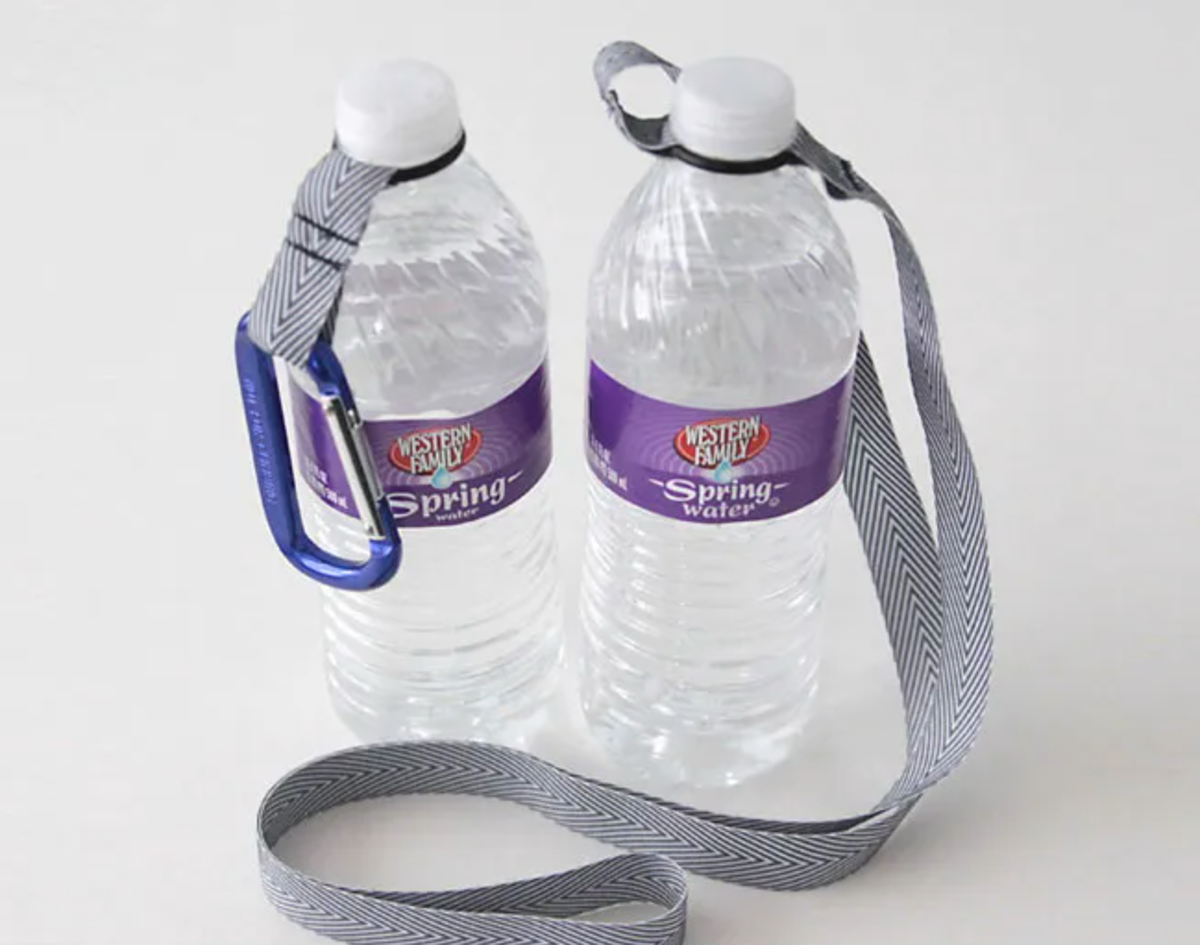 Это приспособление поможет с удобством носить небольшую бутылку с водой на поясе, ремне или на сумке или рюкзаке. Сделать такой держатель очень просто! Это приспособление наверняка пригодится вам в тёплое время года, когда мы больше времени проводим на воздухе. Будь то активные развлечения или простые прогулки, всегда полезно иметь с собой запас воды — и подобный держатель поможет держать бутылочку под рукой. Можно сделать держатель на длинной лямке, чтобы надеть его через плечо, или на короткой с карабином, чтобы прикрепить его к шлёвке джинсов, ремню, сумке или рюкзаку. Как сшить сумочки и чехлы для бутылок с водой, читайте в подборке мастер-классов, которую вы найдёте по ссылке. Вам потребуется: Шаг 1 Для держателя с длинной лямкой через плечо отрежьте ленту длиной около 120 см. Конец ленты проденьте в резиновое кольцо, конец подверните на 1-1,5 см, чтобы скрыть необработанный край и проложите по одной линии прочную строчку: тут это тройная строчка. Также можно использовать пистолет