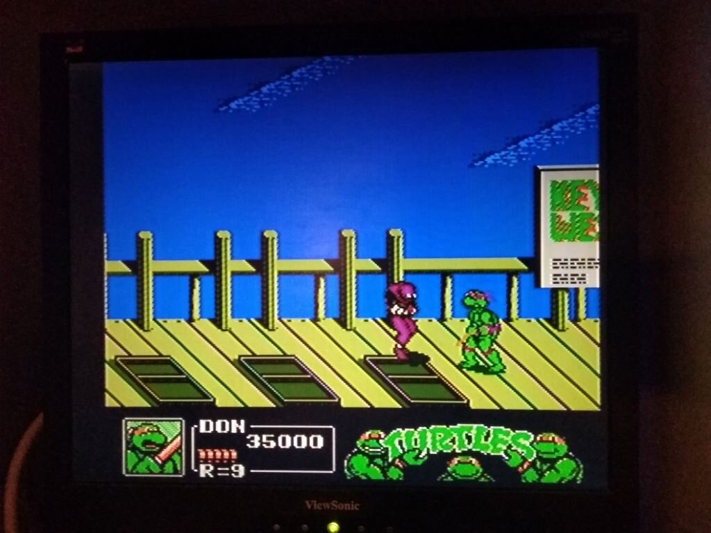Отдельно в прошлые выходные с братиком очень классно порубился в Черепашек мутантов ниндзя 3 (Turtles 3). Очень красочная игрушка. 4 черепашки на выбор с разным вооружением. Нунчаки, палка, кинжалы. Как братик - сказал – это та самая игрушка, где на пляже все начинается! Кстати, к моему, удивлению, довольно неплохо прошли вперед. Рубились неплохо так. В игре разные уровни. Все они довольно красивые и большие. Есть уровень с серфингом. Очень динамичный уровень. Голубая вода. И ты серфишь! Прикинь, черепашка-серфер! Это просто вау! Есть уровень на огромном мосту. С дырками в пропасть. Будь осторожен. Тут на джипе гоняет мутант Рокстеди или Бибоп. Я уже не помню. Опасный противник. Это кажется такой знаменитый красного цвета мост. В реальной жизни такой тоже есть. А потом представляешь себе, кусок суши оторвало прямо в небеса. И Часть города висит в небе. Прямо вот пара улиц, так сказать. И ты по ним ходишь. Графика красивая и, как я бы сказал, в расцвет эпохи 8 бит – трехмерная типа. Ты