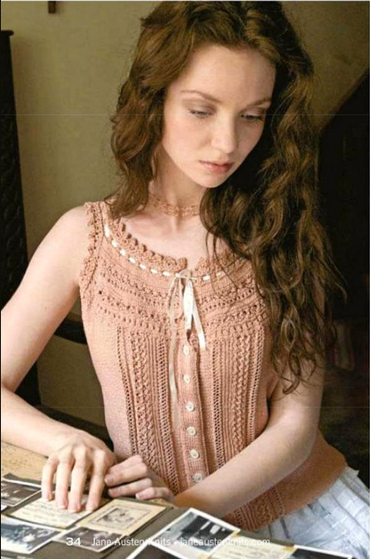 Он вяжется из 3-слойного хлопка, с фигурной спинкой с использованием простых кружевных узоров, с ажурными передними планочками и формирующими элементами на спине. Шелковая лента продета через кокетку для украшения.