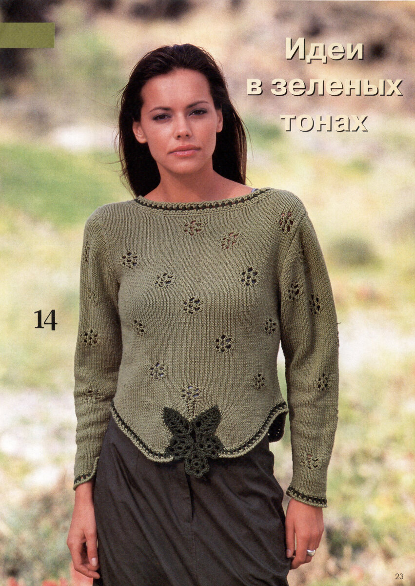 Всем привет! Сегодня добавлю очень интересный джемпер с ажурным узором. Чтобы сделать его более современным можно не обвязывать крючком, и связать свободного кроя. И цвет можно взять более нежный. А вы как думаете? Размеры: 36/38 (42/44) Данные для больших размеров стоят в скобках. Если цифра одна, то она относится ко всем размерам. Вам потребуется: 650 (700) г. пряжи цвета хаки и 100г. оливковой "Catania" (100% хлопок, 125м/50г.) Спицы и крючок № 3,5 и вспомогательная спица. Лицевая гладь: лицевые петли в лицевом ряду и изнаночные петли в изнаночном ряду. Ажурный цветок (на 8п.): вязать по схеме А. Цифра справа означает лицевой ряд. В изнаночном ряду петли и накиды вязать изнаночными петлями. Если 2 накида следуют один за другим, первый вязать изнаночными, второй лицевой или изнаночной скрещенной петлей. В ширину и высоту 1х повторить п. схемы и р. Ажурные цветы (на 8п.): вязать по схеме В. Цифра справа означает лицевой ряд. В изнаночном ряду петли и накиды вязать изнаночными петля