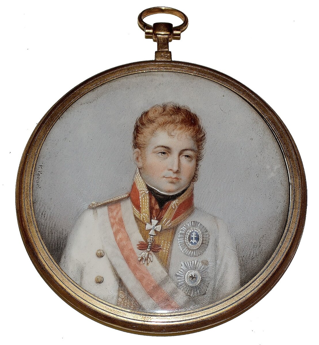 Когда-то на американском аукционе продали предмет, аннотированный как «миниатюра на слоновой кости – портрет прусского офицера XIX в.» Описание лота не отличалось особой информативностью: «Портрет помещен в овальную латунную рамку с черепаховым задником. Офицер одет в белый мундир с красно-золотым стоячим воротником. Он носит несколько медалей и орденскую ленту». Возможно, американские аукционные эксперты настолько далеки от знания истории европейского континента или, может быть, имели место какие-то махинации со стороны продавцов, но личность этого «прусского офицера» вполне легко идентифицируема. Наверно, кто-то из комментаторов опять упрекнет меня в том, что я доказываю очевидные вещи, но для тех, кому интересно, я продолжу. Итак, перед нами действительно персонаж в белом мундире с красным воротником. И борт мундира, и края воротника расшиты золотом. Мундир этот принадлежит высшему офицеру Австрийской империи начала XIX в. Его награды, хотя в общем и узнаваемы, но их знаки изображен