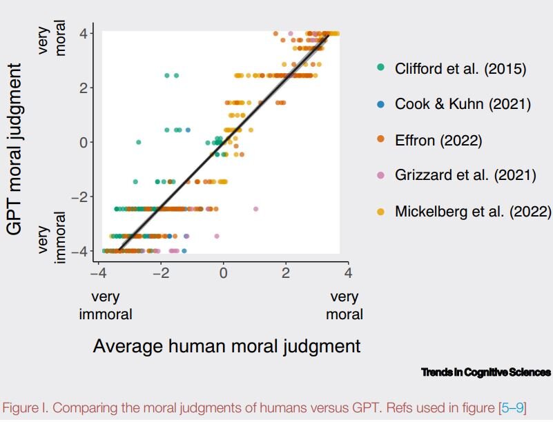 Проверив ChatGPT на 464 моральных тестах (кражи, убийства, игра “Ультиматум”, эксперимент Милгрэма, выборные коллизии и т.д.), исследователи получили фантастически высокую корреляцию (0.95) социальных и моральных суждений ChatGPT и людей.