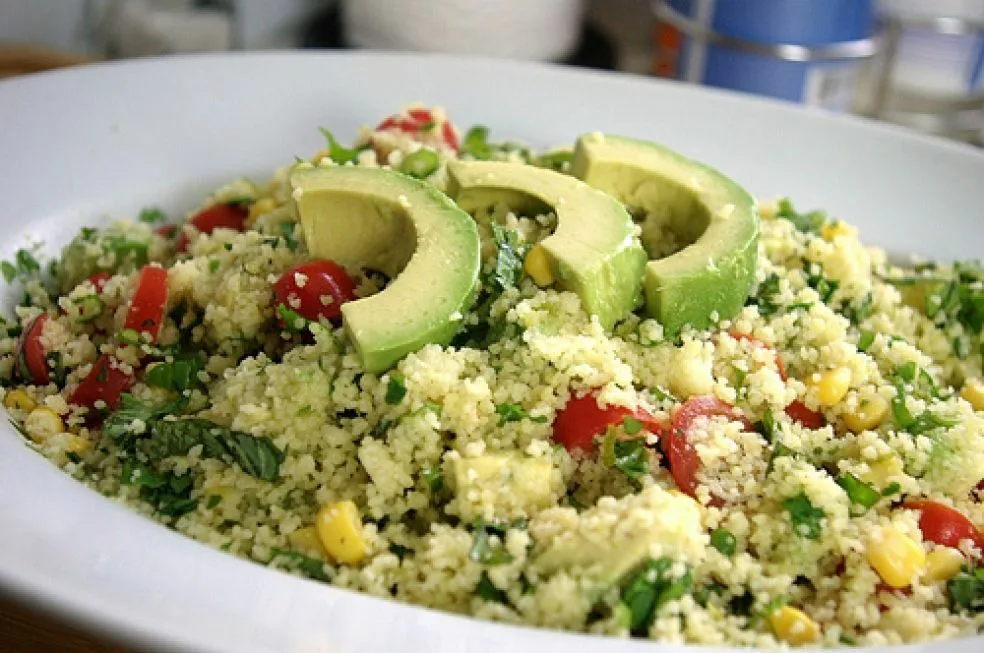 4. Готовый кускус переложить в большую миску, добавить овощи, зелень, оливковое масло, сок лимона, соль и перец по вкусу. Хорошо перемешать.