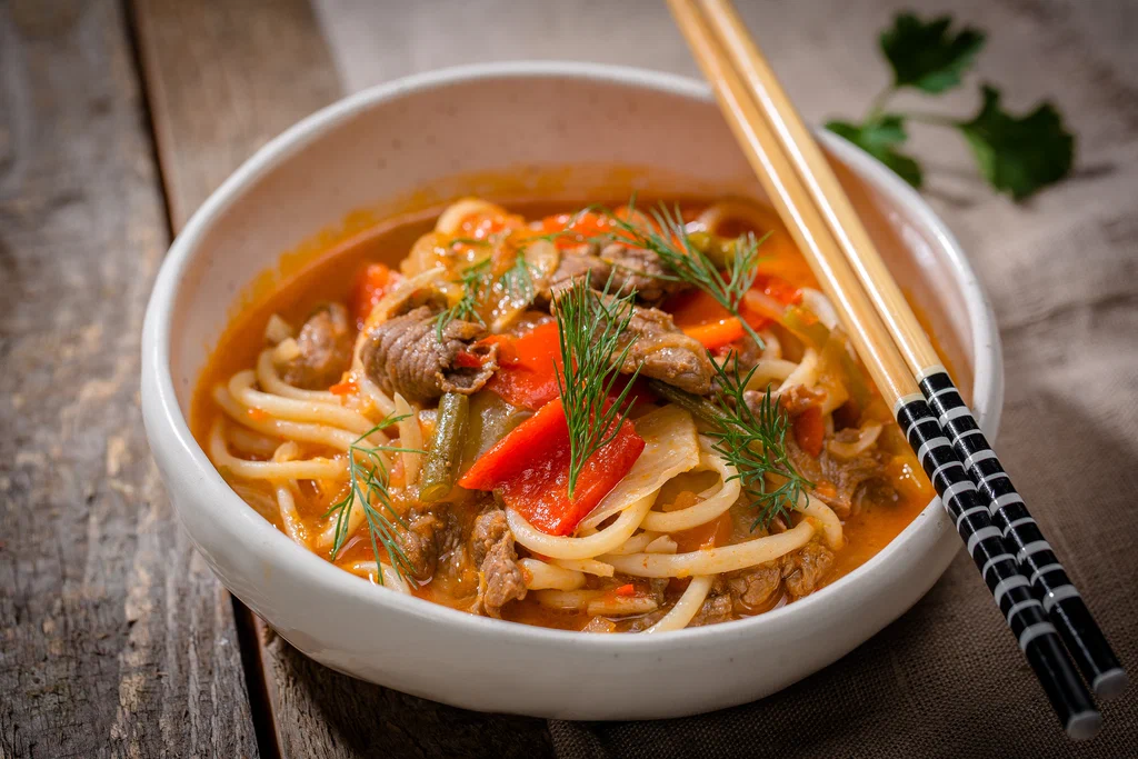 Этот аппетитный суп с фунчозой, грибами, овощами и соевым соусом удивит вас своим глубоким и насыщенным вкусом, несмотря на простоту приготовления и небольшой набор ингредиентов. Обжаренные грибочки и соевый соус - это те компоненты, которые придают готовому блюду яркий незабываемый вкус! ИНГРЕДИЕНТЫ Фунчоза - 90 г Шампиньоны - 100 г Перец красный болгарский - 60 г Помидоры - 85 г Морковь - 90 г (1 шт.) Лук репчатый - 85 г Соус соевый - 25 мл Масло растительное - 4 ст. ложки Соль - 0,5 ч. ложки Перец чёрный молотый - на кончике ножа Вода - 800 мл ТЕХНОЛОГИЯ ПРИГОТОВЛЕНИЯ 1. Подготовьте необходимые продукты. 2. Морковь очистите и нарежьте соломкой.