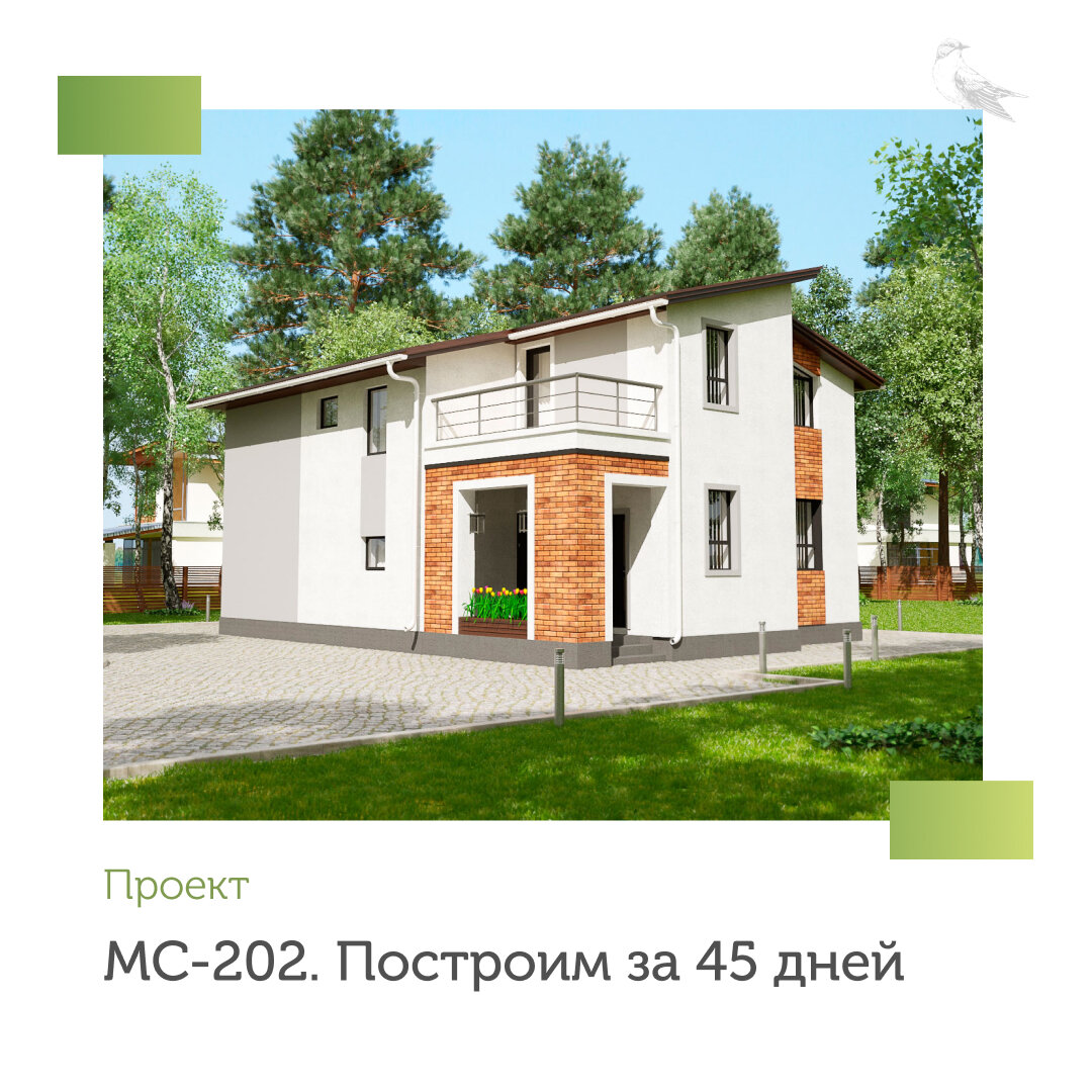 ⭐ Двухэтажный дом МС-202 Хотите построить дом этим летом? Представляем вам проект со сроком возведения 45 дней – двухэтажный дом МС-202 площадью 133, 90 кв. метра. МС-202 рассчитан на семью из 4−5 человек, имеет необычную ассиметричную крышу и панорамные окна, а наличие веранды, террасы и двух балконов добавляют проекту привлекательности. Первый этаж дома – это зона общего пользования. Здесь предусмотрены: ✔️ большая кухня-столовая с выходом на террасу; ✔️ просторная гостиная с выходом на веранду; ✔️ санузел; ✔️ техническое помещение; ✔️ холл. Второй этаж предназначен для отдыха и включает: ✔️ 2 отдельные спальни; ✔️ спальню с гардеробом и выходом на балкон; ✔️ 2 санузла; ✔️ холл с выходом на балкон. В проекте возможны изменения планировки: ◼️ разделение помещения на первом этаже на кухню и столовую дверью или арочным проходом; ◼️ объединение малых спален на втором этаже в большую комнату. Строительство дома по проекту МС-202 доступно в комплектации «Тёплый контур»: ◼️ фундамент; ◼️ ко