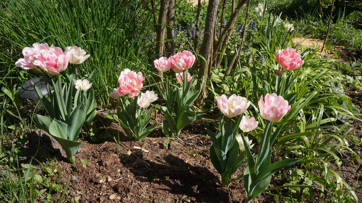 В мае отцветают первые простые тюльпаны, на смену приходят многоцветковые и махровые. Такой огонь у меня получился в этом году под яблоней: Примерно в 1,5 раза разрослись ботанические тюльпаны Литтл Бьюти: Так полянка выглядела год назад: Кстати, хоста во время их цветения развернула свои листья намного сильнее: Осенью я хотела сделать парадную, но менее яркую композицию рядом со входом в наш домик: Выбор пал на пионовидные тюльпаны и многоцветковые: Получилось очень нежно, по-моему: Но если вспомнить, что именно я сажала... Многоцветковые по цвету решили мимикрировать под пионовидные. Желтые еще до конца не раскрылись. Может, красная полоска еще проявит себя.Но без нее тоже неплохо. В другом месте многоцветковый просто одноцветковый: Когда мы первый раз приехали на наш дачный участок в мае 2017 года, я увидела алые тюльпаны среди сорняков: Примерно так же они встречали нас через год в 2018 году. В 2021 году я их пересадила. Пересаживала весной. Везде, где видела листья, копала, как