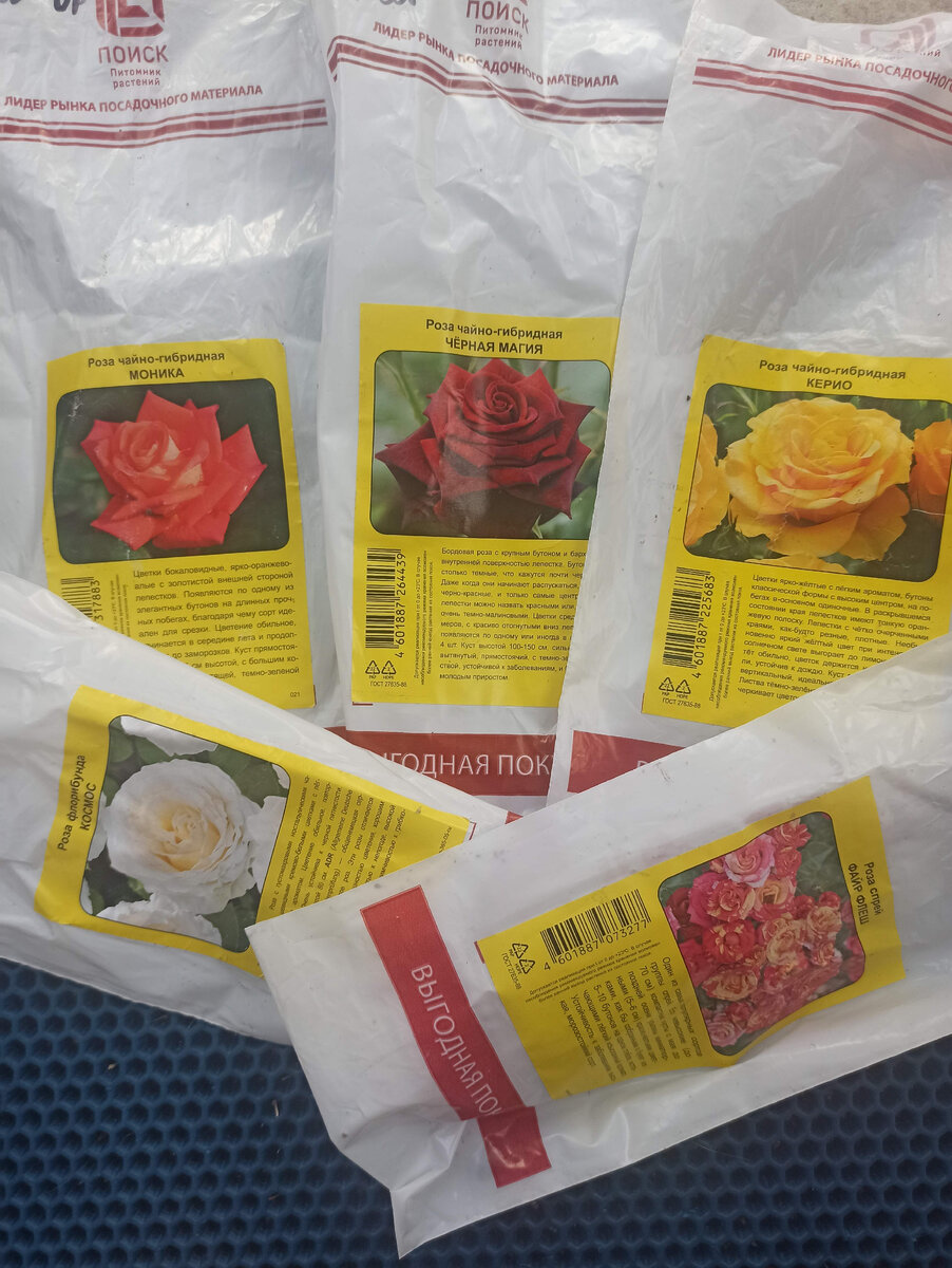 И так пройти мимо роз по 187р. в Доброцене я не смогла. При том что сами саженцы были довольно зелены толсты и по такой цене очень ничего так смотрелись. Позвонив маме и предложив ей посадить у себя несколько кустов. Выбрала пять саженцев с разными картинками на упаковке. При этом если чайно-гибридные саженцы очень сильно похожи друг на друга статью и колючками, то вот предполагаемые флорибунда и спрей отличались. Так что возможно будет и не пять одинаковых чайников а три чайника красных бархатных и пара неизвестно кого. Посажены они с западной стороны дома в палисаднике. Солнце только с обеда и до заката. На этой стороне улицы обычно цветы распускаются чуть позже чем на противоположной. Предполагаемая Черная Магия. Предполагаемая Керио. Предполагаемая Моника. Предполагаемый Фаер Флеш спрей. Предполагаемый Космос флорибунда. Все тронулись в рост. Выглядит не плохо пока. А вы сажали не дорогие розы из эконом магазинов? Вырастало что-то по заявленной картинке или только красные чайники п
