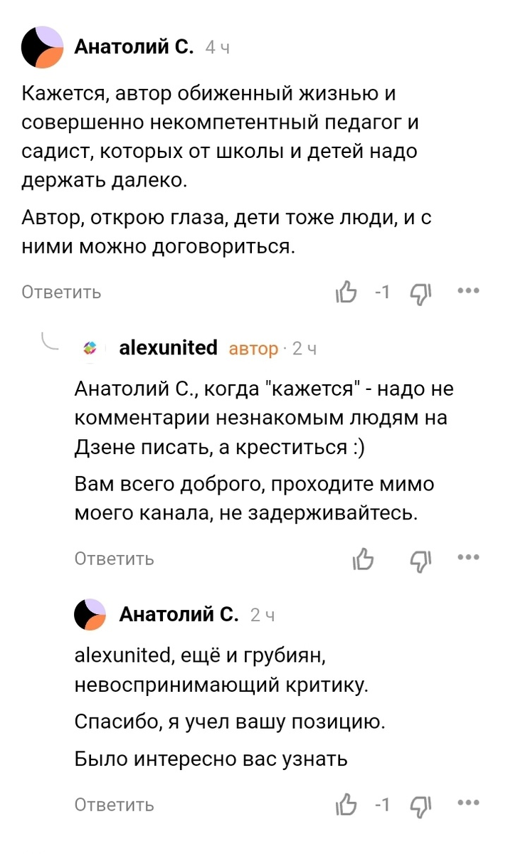 Я недавно поймал себя на том, что наконец-то научился адекватно относиться к критике. В условные 18 лет я считал себя самым умным и любое противоположное мнение считал глупым, встречая презрительным "ну-ну" или оскорблениями. В условные 24 я, наоборот, хотел всем нравиться, поэтому любое негативное суждение погружало меня в депрессию: "меня поругали, значит я плохой". Сейчас мне условно 30 (чуть меньше) и я делю критику на конструктивную и неконструктивную. Первая полезна: в споре с критиком можно либо отточить аргументы своей позиции, либо изменить эту позицию под влиянием аргументов критика. Вторая бесполезна - люди, которые ругают меня просто потому, что у них иное мнение, которое они не готовы аргументировать, ничем мне не помогут. Тратить время на споры с ними нет смысла. Судите сами: Приходит какой-то дебил глубоко несчастный человек и с порога пишет набор оскорблений. Была ли в его сообщении вообще "критика" (по его мнению - да)? В условные 18 я бы обязательно сообщил такому чел