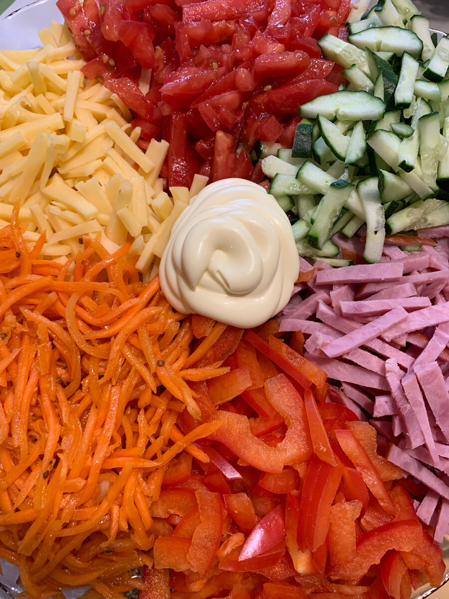 В равных пропорциях на блюдо нужно выложить: овощи, сыр и мясо порезать одинаково. в центр тарелки майонез - красивый салат готов, после подачи перемешать и угощать родных. Было вкусно! Приятного и Вам аппетита! всего Вам доброго❤️