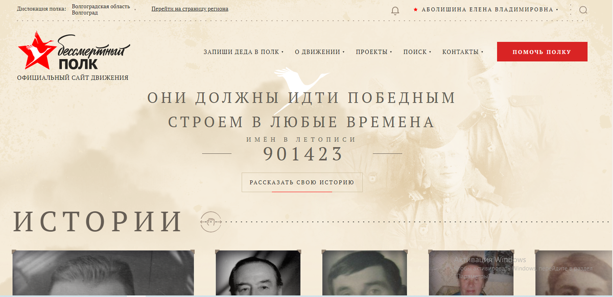 В личном кабинете или по кнопке ЗАПИШИ ДЕДА В ПОЛК главной страницы вы попадаете в раздел ИСТОРИЯ СОЛДАТА