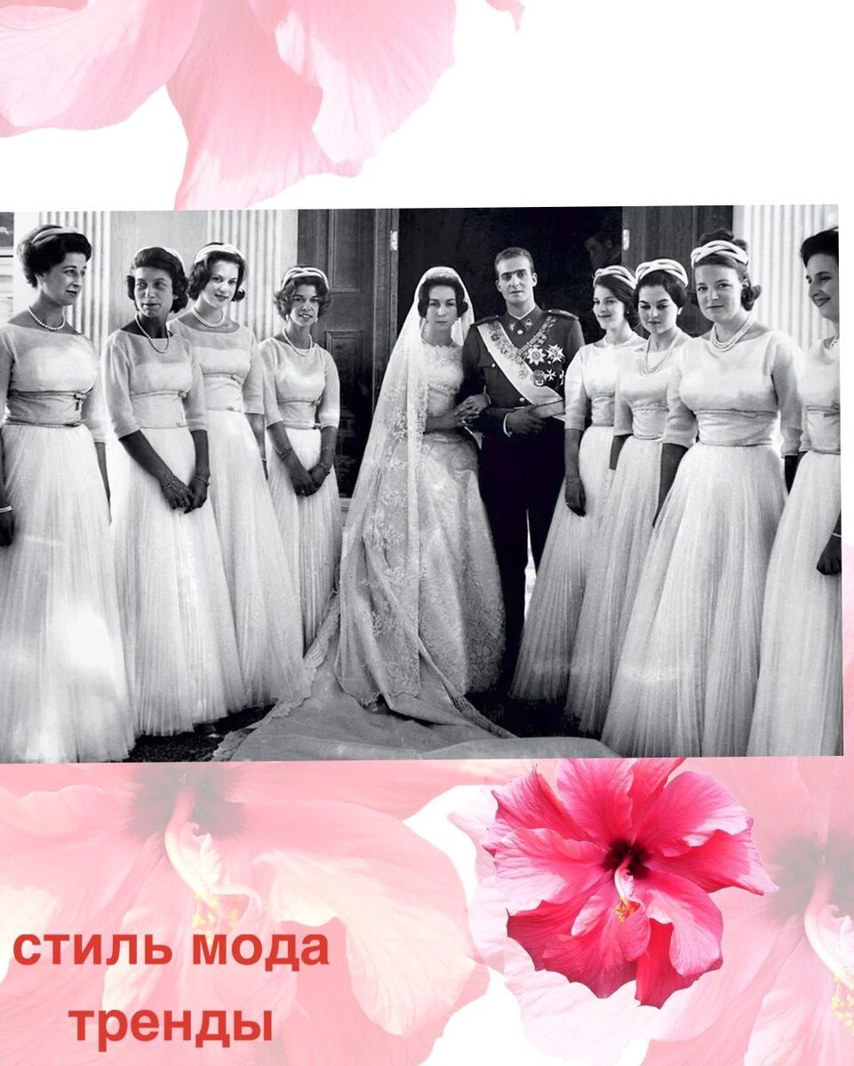 На принцессе Греции и Дании Софией на ее свадьбе с принцем Испании Хуаном Карлосом в Афинах было серебристое платье из ламе, покрытое тюлем и антикварным кружевом, созданное в Греции Жаном Дессе, парижским кутюрье с греческими корнями, который также сшил платья восьми подружкам невесты. У девушек драгоценности тоже были одинаковые.