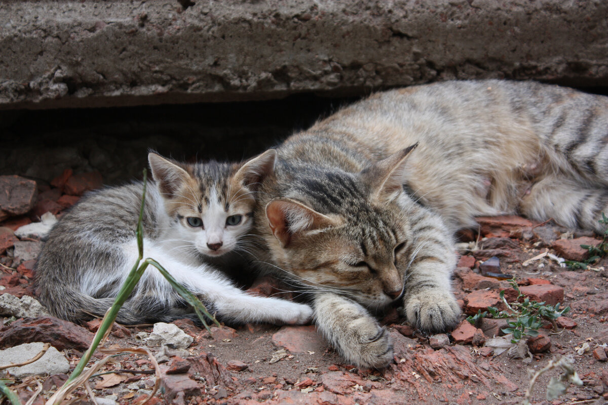 Кошка остановилась, присела, нежно положив котенка на асфальт, и принялась умывать его. А малыш пытался покормиться молоком. Но, у кошки, измотанной и уставшей, молока было мало. Дети, игравшие во дворе, забыли про игру и, как завороженные, смотрели на происходящее.