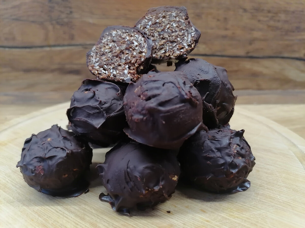 Количество ингредиентов на 9 конфет! Ингредиенты : Орехи любые - 80 гр Финики - 100 гр Овсяные хлопья - 100 гр Какао - порошок - 15 гр (1 ст. л с горкой) Мёд 2 ст. л Финики промыть, удалить косточку. Все ингредиенты смешать в блендере. Сформировать конфеты. Для глазури: Шоколад темный - 60 гр Масло сливочное - 20 гр Растопить шоколад и масло на водяной бане или импульсами в микроволновке. Глазировать конфеты. Убрать в холодильник на 20 минут! На 100 грамм - 460 ккал; БЖУ: 6,5/26,2/52,1 Приятного аппетита!