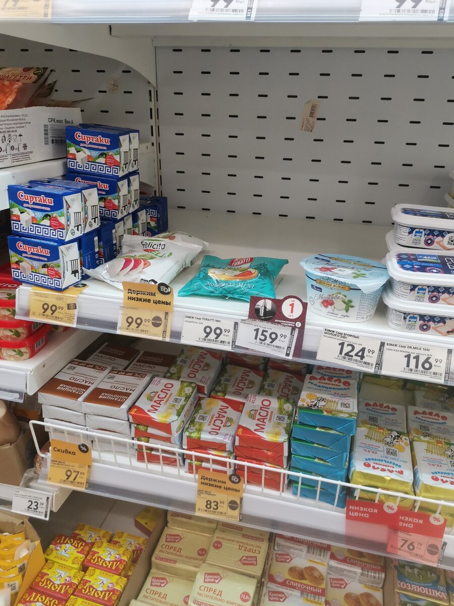 Приходила за сливочным маслом, в итоге помимо него накупила еще и сыра. да не абы какого, а того, что добавляю в салаты или предпочитаю на завтрак. Верхняя полка как раз состоит из такой продукции, поэтому расскажу что приглянулось: сиртаки для греческого салата за 99 рублей, моцарелла за такую же стоимость, брынза за 116 рублей. Последний сыр не по акции, но тем не менее цена хорошая, а качество устроило целиком и полностью.