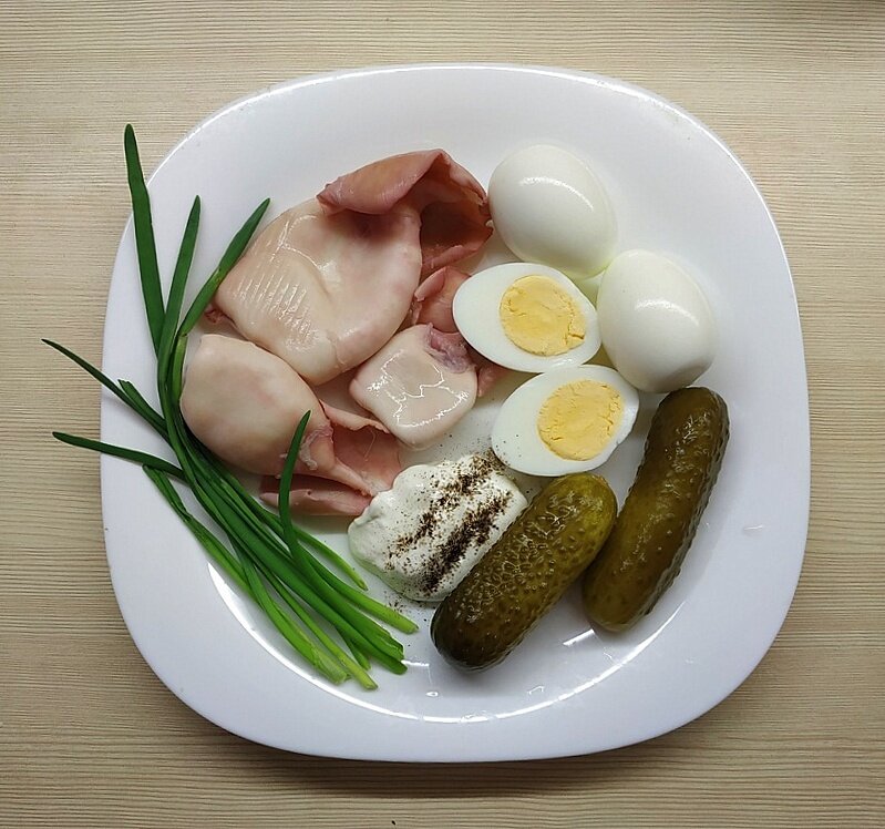 Оригинальный рецепт диетического салата с кальмарами и как бонус — секрет маринованных огурцов по-домашнему. Кальмары — это один из самых популярных продуктов для диеты. В них очень мало калорий и при этом большое количество белка. Я решила поэкспериментировать со вкусом и сделать сочетать вареный кальмар с маринованными огурцами собственного производства. Вы можете купить соленья в магазине или попробовать мой фирменный рецепт маринованных огурчиков, которые просто невозможно испортить. Но об этом в конце. Список продуктов Для салата я взяла: ✔ кальмар вареный — 100 г; ✔ яйцо куриное сваренное вкрутую — 3 шт; ✔ маринованные огурцы — 120 г; ✔ лук зелёный; ✔ сметана — 50 г; ✔ черный молотый перец. Никаких премудростей — основные продукты нарезать и смешать со специями. Если в огурцах соли недостаточно, то можно подсолить по вкусу. Да, это уже был готовый салат. Я попробовала его и мне очень понравился вкус, но что-то не хватало... Мне недостаточно было ещё одного ингредиента — консерви