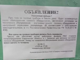 В Балаково жители 18 домов продолжают оставаться без газа с 9 мая. В праздничный день произошло обрушение кирпичной стены дореволюционной постройки на газовую трубу. Местный филиал Газпрома отказывался проводить работы по ремонту поврежденного газопровода, пока «кто-нибудь» не разберет завал. В субботу, 13 мая, администрация Балаковского района организовала работы по разбору обрушившейся части стены. В этот же день газовики отремонтировали трубу. Но газ подключать жителям отказываются, пока не будут заключены договоры на обслуживание и не проведут техническое обслуживание газового оборудования во всех домах по ул. Коммунистической, 54, 58, 58а, 60, 62, 64, 70, 72; ул. Вольской, 10,12, 12а, 14; ул. Московской, 61, 61а, 63, 65, 67, 71. Никакие сроки подключения не сообщаются.