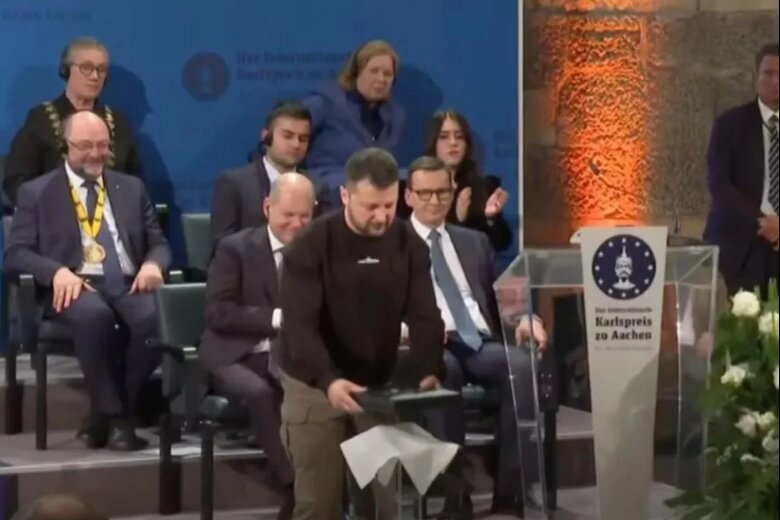 Владимир Зеленский 14 мая стал обладателем Международной премии Карла Великого. На церемонии вручения награда выпала у него из рук. Лидер Украины заявил, что это случилось по вине русских. Украинский президент Зеленский после торжественного вручения ему престижной премии хотел произнести речь. В начале выступления он случайно выронил свою награду и в шутливом тоне свалил вину за происшествие на русских. Канцлер Германии рассмеялся, оценив шутку Зеленского. После обвинения в адрес россиян глава Украины добавил, "мы не боимся", ведь "мы вместе". Слова вызвали буру аплодисментов. Церемония проходила в германском городе Ахене. В числе почетных гостей присутствовали Урсула фон дер Ляйен, Матеуш Моравецкий, был и сам канцлер Германии Олаф Шольц. Произнося речь, Владимир Зеленский подчеркнул, что граждане его страны - все герои и каждый достоин того, чтобы принимать такую же награду. Далее президент Украины напомнил о том, что Европа должна выделить новую порцию вооружения для ВСУ. Премия име