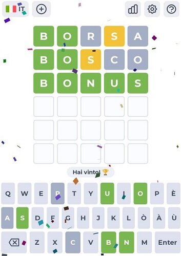 Если вы изучаете итальянский уже, например, полгода - год, попробуйте поиграть в Wordle (Вордли) на итальянском. Бросьте вызов вашему словарному запасу! Смысл игры: вам нужно угадать слово из 5 букв за максимум 6 попыток. Сначала вы пишите любое итальянское слово из 5 букв, которое пришло вам в голову. Серым цветом в этом слове будут отмечены буквы, которых нет в загаданном слове. Зеленым цветом загораются буквы, которые в слове есть и они стоят на своих позициях. желтым отмечены буквы, которые есть в слове, но на другой позиции. Играть можно здесь: Это залипательная игра, которая покажет, насколько широк ваш словарный запас на итальянском. Чем быстрее вы отгадываете слово (чем меньше попыток тратите), тем он шире и тем лучше развита ваша лингвистическая эрудиция. А иногда просто везет: ______________________ Статья в тему: