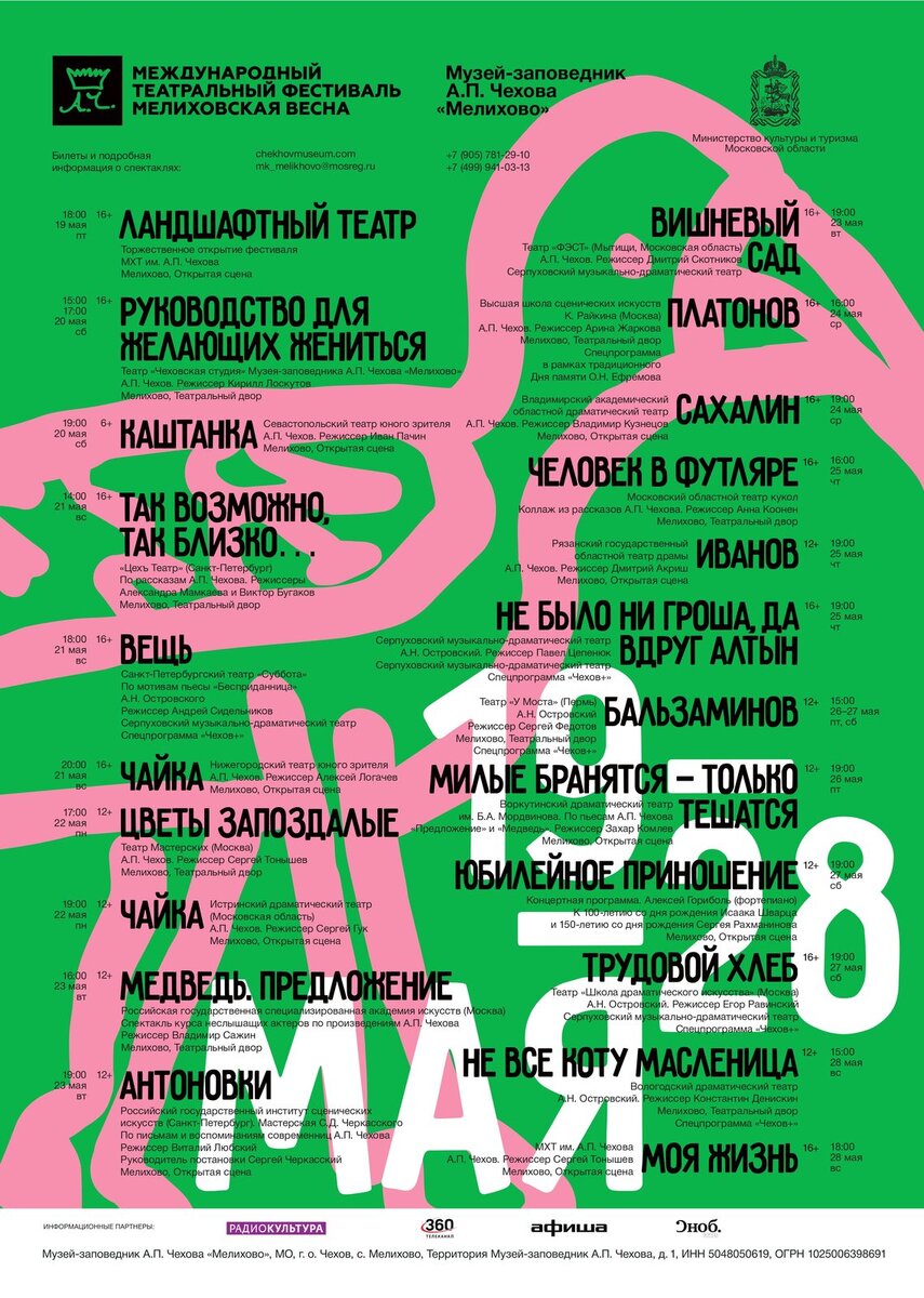 В подмосковной усадьбе Антона Павловича Чехова с 19 по 28 мая в 23-й раз пройдет международный театральный фестиваль «Мелиховская весна». С этого года его художественным руководителем стал худрук МХТ имени А.П.Чехова Константин Хабенский, уточняет пресс-служба смотра. «Чехов – знаковая фигура для Московского Художественного театра и, вместе с тем, постоянная связующая нить нашего театра и музея-заповедника "Мелихово". В Мелихове была написана чеховская "Чайка", на сцене Художественного театра она взмыла ввысь к недосягаемым высотам, перевернув впоследствии каноны и традиции всего мирового драматического театра. Эта незримая связь длится многие годы, а теперь станет еще крепче. Большая радость и огромная ответственность быть одновременно руководителем театра, носящего имя Чехова, и принять художественное руководство старейшим в стране фестивалем, посвященным творчеству великого писателя. Фестивалем, показывающим, какой Чехов сегодня», — прокомментировал свое назначение Хабенский. На еже