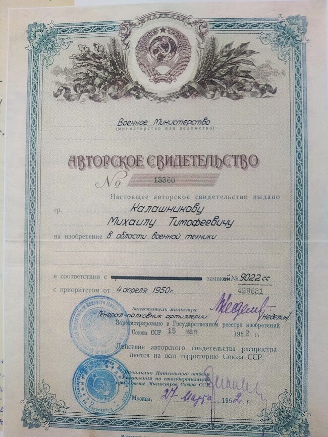 15 мая 1952 в Государственном реестре изобретений СССР было зарегистрировано авторское свидетельство за номером 13360 на автомат под патрон образца 1943 года. Отличительной особенностью автомата является то, что уменьшение вредных сопротивлений в движении деталей автоматики достигнуто за счет направления затворной рамы тремя малыми поверхностями - две поверхности в задней части затворной рамы и одна поверхность на штоке рамы...