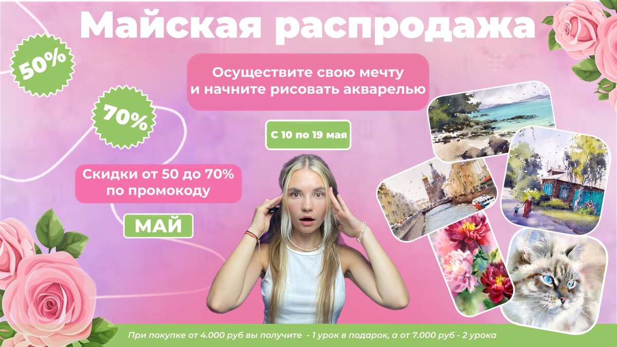 🌸 С 10 по 19 мая выбирайте курс по акварели, о котором вы мечтали. Для вас действует до -70% на весь наш каталог, целых 140 акварельных курсов и мастер-классов! 💴 1 мастер-класс — от 745р. вместо 1.490р