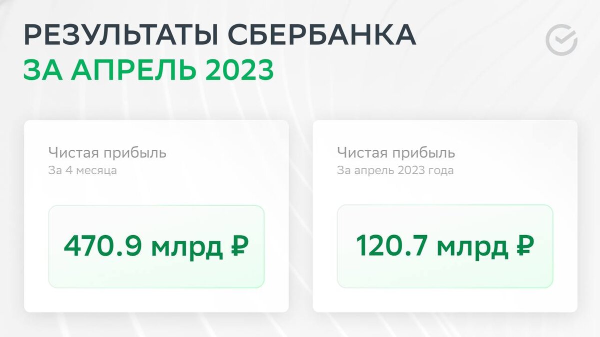 А ещё сегодня Сбер поделился результатами по РСБУ за 4 месяца 2023 года. Чистая прибыль составила 470 млрд рублей. Банк идёт на рекордные показатели в истории.