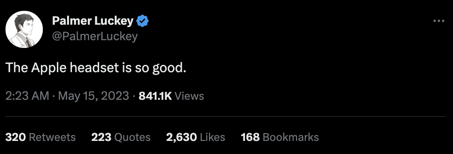 Гарнитура дополненной реальности от Apple может стать самым спорным продуктом компании на сегодняшний день. Однако, если верить твиту основателя Oculus, девайс произвел на него впечатление. Тем не менее, положительные отзывы одного человека не станут решающим фактором для успеха этого устройства, потому что Apple необходимо продать огромное количество этих гарнитур. Палмер Лаки, основатель Oculus, опубликовал в Twitter небольшой, но весьма значимый твит о гарнитуре дополненной реальности. Из твита Лаки можно сделать вывод, что ему была предоставлена демонстрационная версия, и, судя по всему, он в восторге от устройства. Это вполне вероятно, учитывая что ранее была информация о демонстрации девайса для топ-руководителей Apple. Возможно, основатель Oculus и Apple договорились о личной встрече, на которой Лаки смог бы посмотреть гарнитуру дополненной реальности. Зная предпочтение Apple к сохранению любой ценной информации о своих продуктах в тайне, можно предположить, что этот шаг включал