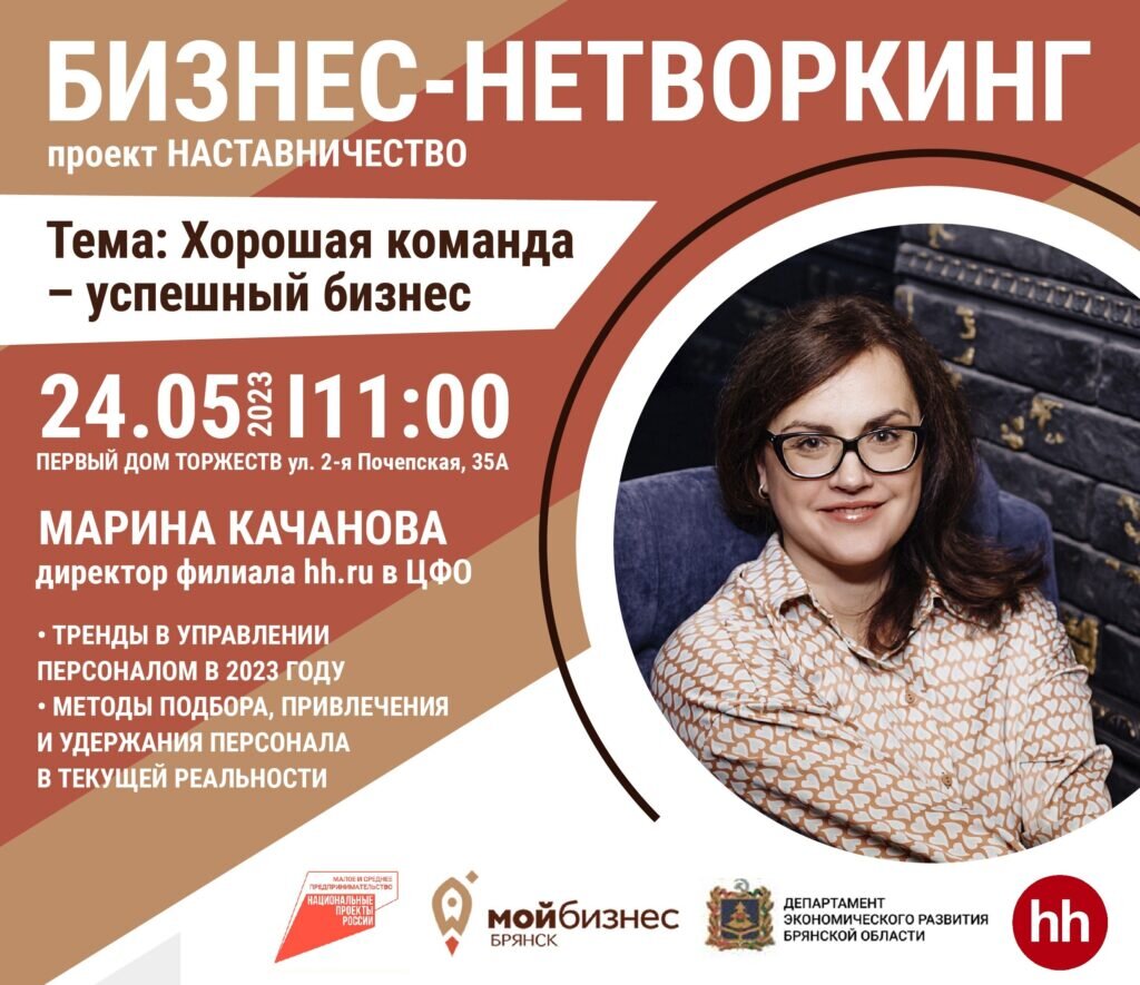 В Брянске 24 мая состоится бизнес-нетворкинг с директором филиала hh.ru в ЦФО Мариной Качановой. Место проведения – Первый дом торжеств (Брянск, улица 2-я Почепская, 35А). Начало – в 11:00. Участие в мероприятии для бизнесменов бесплатное, так как оно проходит в рамках национальному проекту «Малое и среднее предпринимательство». Тема встречи: хорошая команда – успешный бизнес: где найти качественный персонал, как его привлечь и удержать. Зарегистрироваться можно, перейдя по ссылке. Более подробную информацию можно получить по телефонам: 8-920-840-91-09, 8-4832-58-92-77. 12+ Брянцев пригласили на бесплатный бизнес-нетворкинг