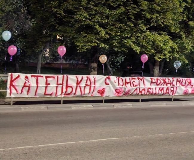 Неизвестный житель Тулы довольно романтично поздравил даму своего сердца с днем рождения, развернув на улице баннер в ее честь. На большом полотнище он написал: “Катенька! С днем рождения, любимая!”, похвально сохранив при этом орфографические и пунктуационные нормы русского языка. Послание от любящего сердца заметили очевидцы на улице Кирова рядом с остановкой “Замочная” 15 мая. Кадрами они поделились в паблике “Подслушано в Туле”. Как отмечается, послание появилось вечером в воскресенье. Плакат при этом был украшен воздушными шарами. Однако на фотографиях, сделанных в понедельник, шары уже куда-то благополучно исчезли. Автор необычного поздравления неизвестен, как и реакция на него адресата. Тем не менее настроение от увиденного поднялось у всех Кать. И, как отмечают пользователи в комментариях, — не только у Кать.