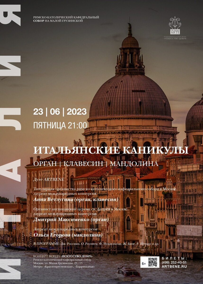Дж. Россини, О. Респиги, Ф. Мендельсон, Ж. Бизе, Р. Штраус и др. Римско-католический кафедральный собор на Малой Грузинской 23 Июня 2023, 6+. Мероприятие платное от 900₽ – 2500₽ г. Москва, ул. Малая Грузинская, д. 27/13 21:00 - 22:30 Серия концерта: Популярная классика на органе Купить билет можно тут Дополнительные вопросы можно задать по телефону +74992524051 или email: info@artbene.ru